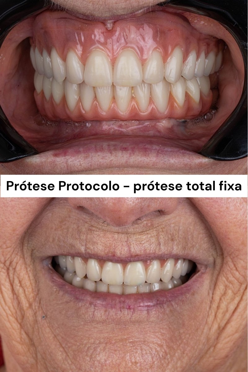 Utilizada quando todos os dentes da arcada foram perdidos. Pode ser removível ou apoiada em implantes para mais segurança.